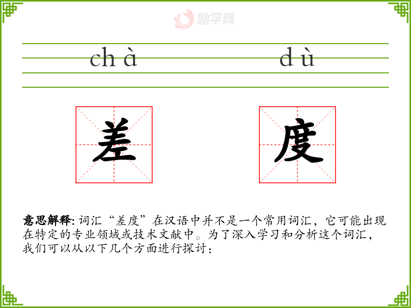 词汇“差度”在汉语中并不是一个常用词汇,它可能出现在特定的专业领域或技术文献中。为了深入学习和分析这个词汇,我们可以从以下几个方面进行探讨: