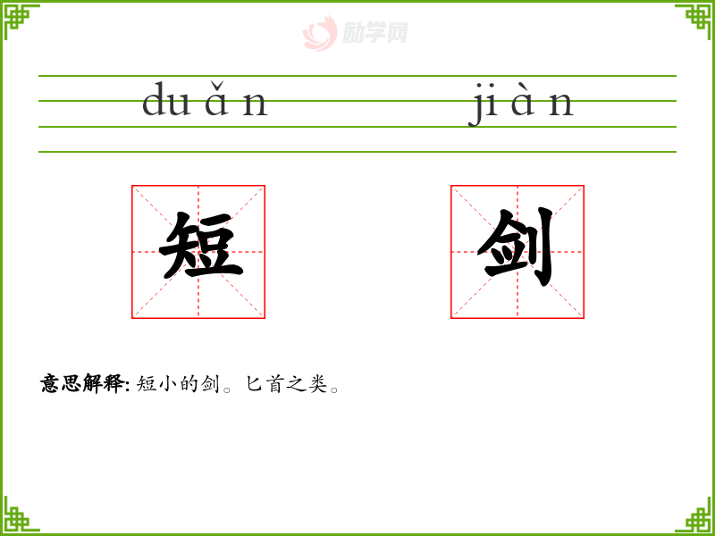 《说文》。注:“今之匕首。”-劒,人所带兵也。 《管子》-昔葛卢之山发而出金,蚩尤受而制之为剑。 《礼记·曲礼》-负剑辟咡诏之。 虞世南《从军行》-剑寒花不落,弓晓月逾明。