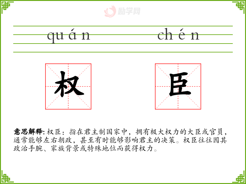 权臣:指在君主制国家中,拥有极大权力的大臣或官员,通常能够左右朝政,甚至有时能够影响君主的决策。权臣往往因其政治手腕、家族背景或特殊地位而获得权力。