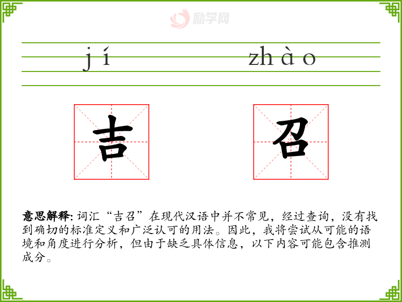 由于“吉召”不是一个标准词汇,我们无法给出确切的字面意思和基本含义。它可能是某个方言词汇、特定领域的术语,或者是某个特定社群中的用语。