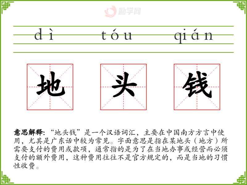 “地头钱”是一个汉语词汇,主要在*南方方言中使用,尤其是广东话中较为常见。字面意思是指在某地头(地方)所需要支付的费用或款项,通常指的是为了在当地办事或经营而必须支付的额外费用,这种费用往往不是官方规定的,而是当地的惯性收费。