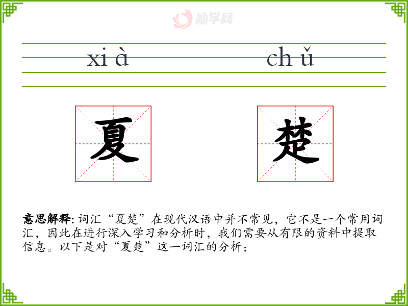 总的来说,“夏楚”这一词汇在现代汉语中并不常见,因此对其进行深入学习和分析时,需要依赖于具体的领域知识和历史文献。如果没有具体的领域知识和历史文献,很难对其进行全面的分析。
