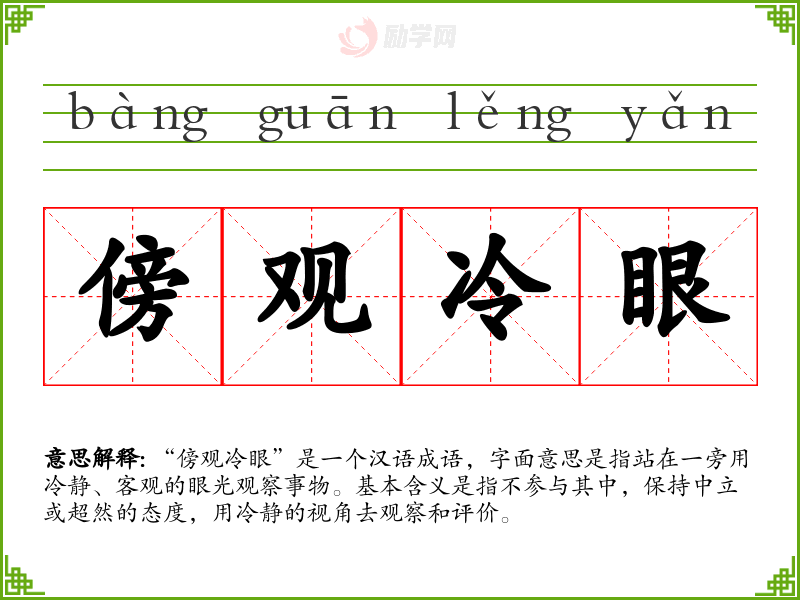“傍观冷眼”是一个汉语成语,字面意思是指站在一旁用冷静、客观的眼光观察事物。基本含义是指不参与其中,保持中立或超然的态度,用冷静的视角去观察和评价。