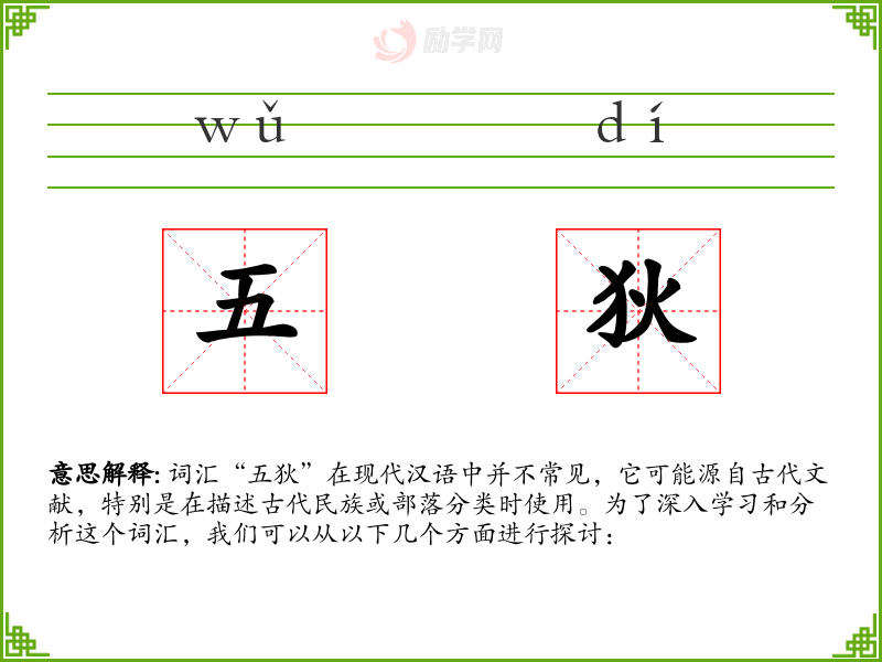 词汇“五狄”在现代汉语中并不常见,它可能源自古代文献,特别是在描述古代民族或部落分类时使用。为了深入学*和分析这个词汇,我们可以从以下几个方面进行探讨:
