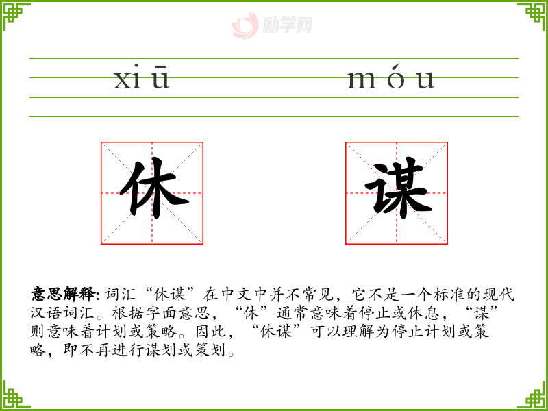 词汇“休谋”在中文中并不常见,它不是一个标准的现代汉语词汇。根据字面意思,“休”通常意味着停止或休息,“谋”则意味着计划或策略。因此,“休谋”可以理解为停止计划或策略,即不再进行谋划或策划。