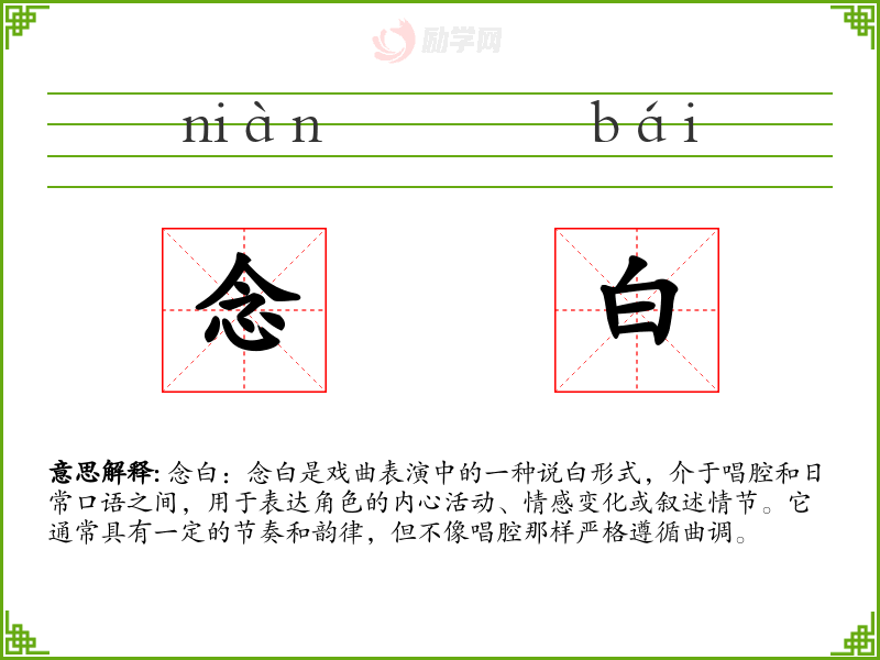 念白:念白是戏曲表演中的一种说白形式,介于唱腔和日常口语之间,用于表达角色的内心活动、情感变化或叙述情节。它通常具有一定的节奏和韵律,但不像唱腔那样严格遵循曲调。