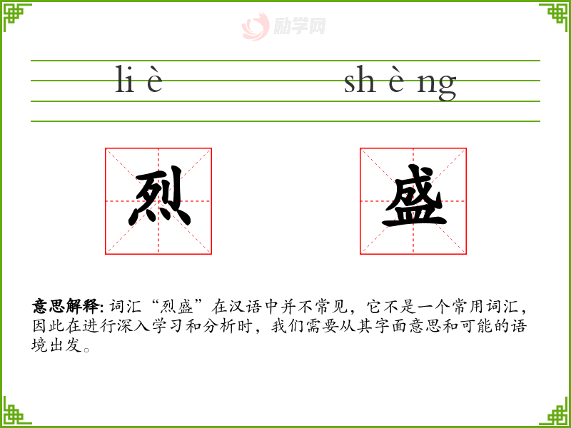 词汇“烈盛”在汉语中并不常见,它不是一个常用词汇,因此在进行深入学习和分析时,我们需要从其字面意思和可能的语境出发。