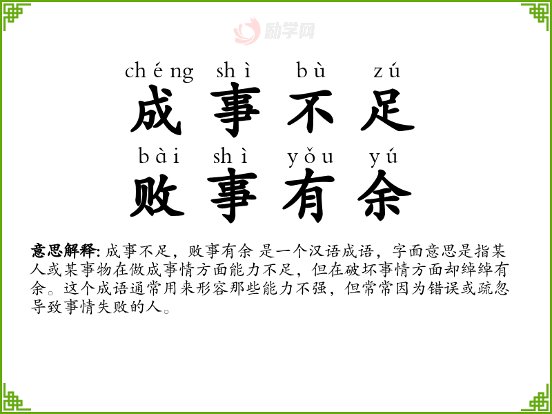 1.成事不足,败事有余的拼音是什么?成事不足,败事有余怎么读?
