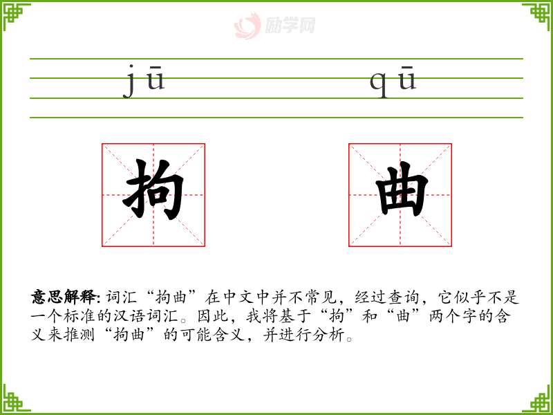 词汇“拘曲”在中文中并不常见,经过查询,它似乎不是一个标准的汉语词汇。因此,我将基于“拘”和“曲”两个字的含义来推测“拘曲”的可能含义,并进行分析。