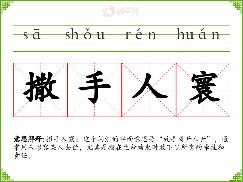 - 文学:在文学作品中,这个词汇常用来表达一种哀伤或无奈的情感,如“他最终撒手人寰,留下了无尽的思念。”