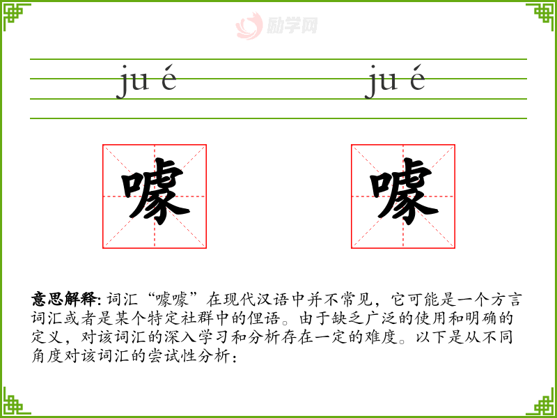 词汇“噱噱”在现代汉语中并不常见,它可能是一个方言词汇或者是某个特定社群中的俚语。由于缺乏广泛的使用和明确的定义,对该词汇的深入学习和分析存在一定的难度。以下是从不同角度对该词汇的尝试性分析:
