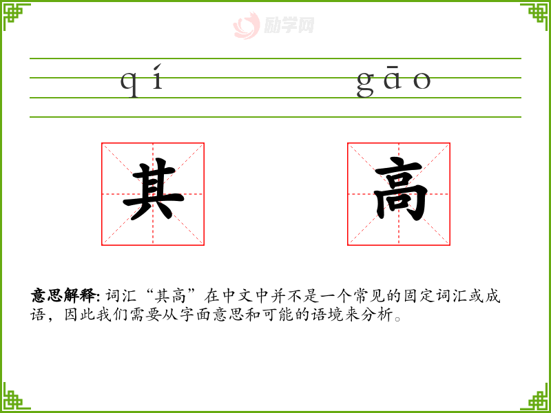 “其高”作为一个表达,虽然在日常语言中不常见,但在特定的语境中可以用来强调物体的高度。在学习语言时,了解这样的表达有助于丰富词汇量和表达的多样性。