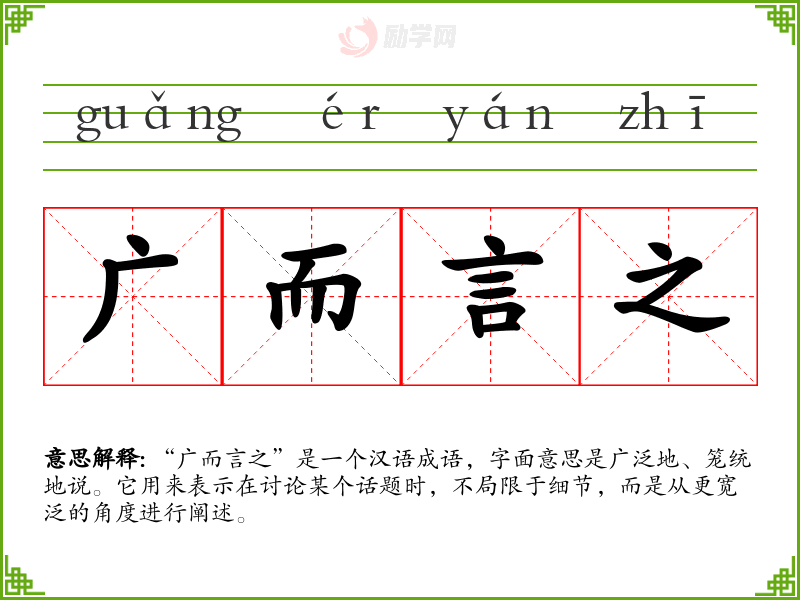 “广而言之”是一个汉语成语,字面意思是广泛地、笼统地说。它用来表示在讨论某个话题时,不局限于细节,而是从更宽泛的角度进行阐述。
