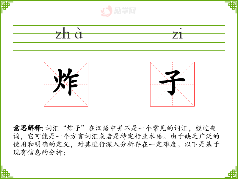 “炸子”这个词汇在普通话中并不常见,可能是某些地区的方言词汇,或者是特定行业的术语。在没有具体上下文的情况下,很难给出确切的字面意思和基本含义。