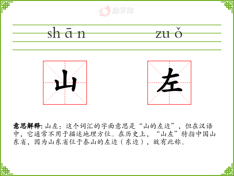 山左:这个词汇的字面意思是“山的左边”,但在汉语中,它通常不用于描述地理方位。在历史上,“山左”特指**山东省,因为山东省位于泰山的左边(东边),故有此称。