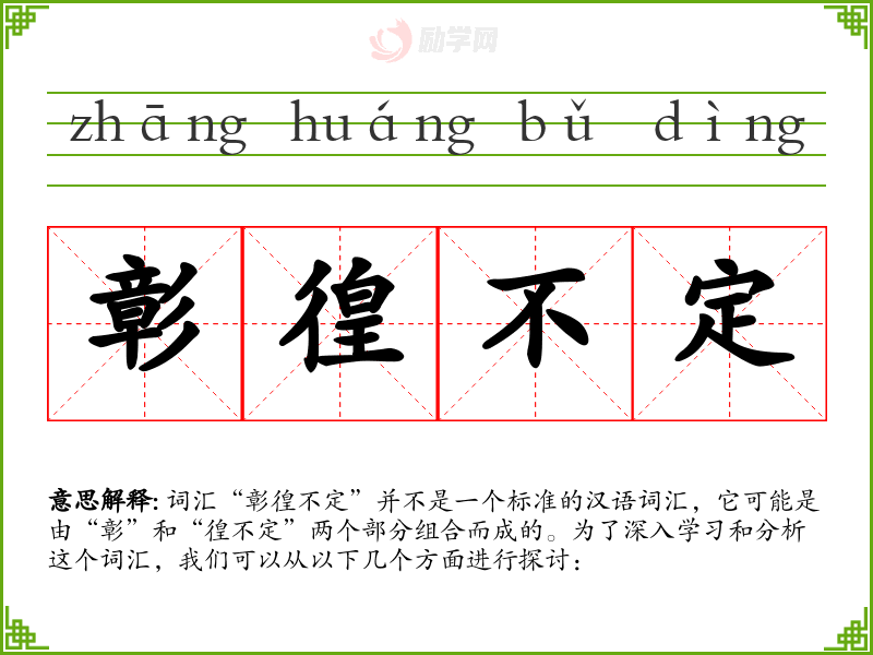 词汇“彰徨不定”并不是一个标准的汉语词汇,它可能是由“彰”和“徨不定”两个部分组合而成的。为了深入学习和分析这个词汇,我们可以从以下几个方面进行探讨: