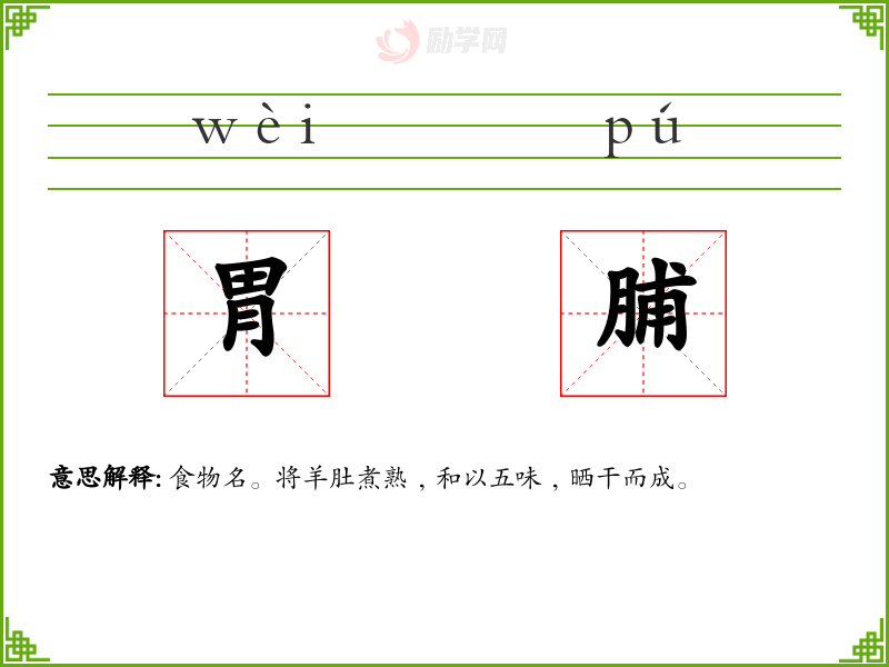 胃脯的意思是:食物名。将羊肚煮熟﹐和以五味﹐晒干而成。