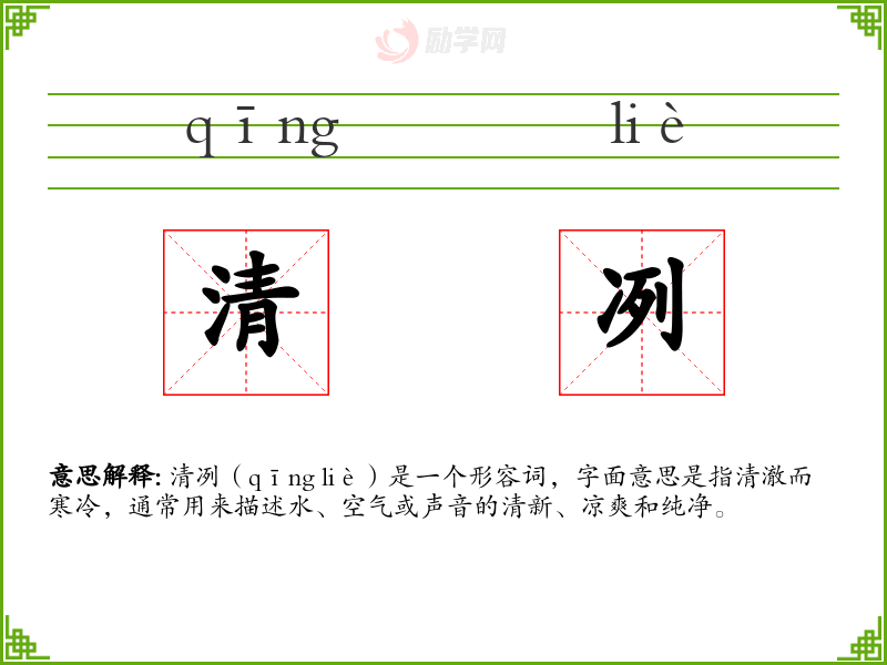 清冽(qīng liè)是一个形容词,字面意思是指清澈而寒冷,通常用来描述水、空气或声音的清新、凉爽和纯净。
