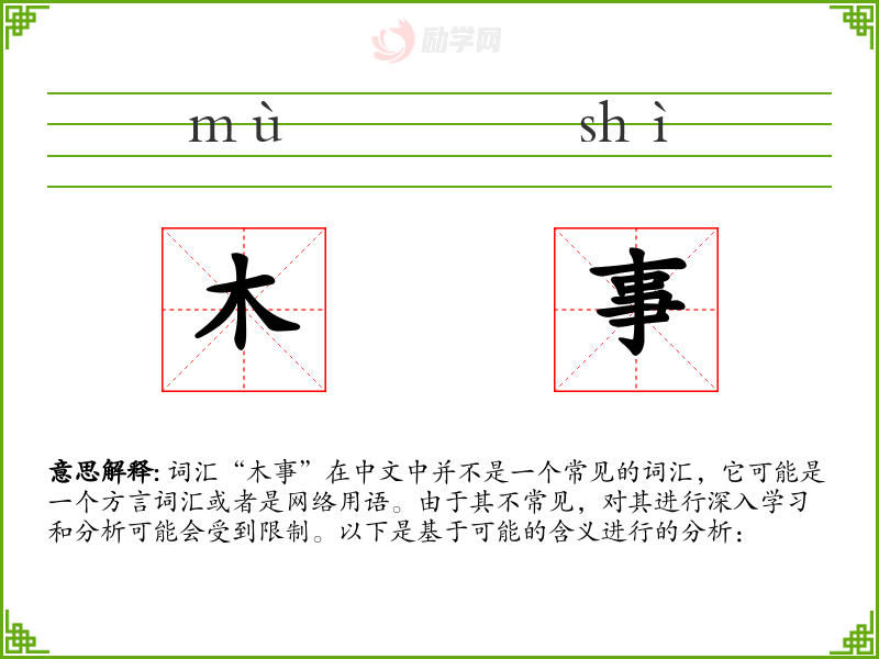 词汇“木事”在中文中并不是一个常见的词汇,它可能是一个方言词汇或者是网络用语。由于其不常见,对其进行深入学习和分析可能会受到限制。以下是基于可能的含义进行的分析: