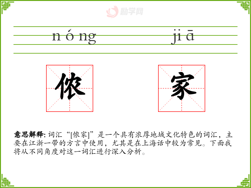 词汇“[侬家]”是一个具有浓厚地域文化特色的词汇,主要在江浙一带的方言中使用,尤其是在上海话中较为常见。下面我将从不同角度对这一词汇进行深入分析。