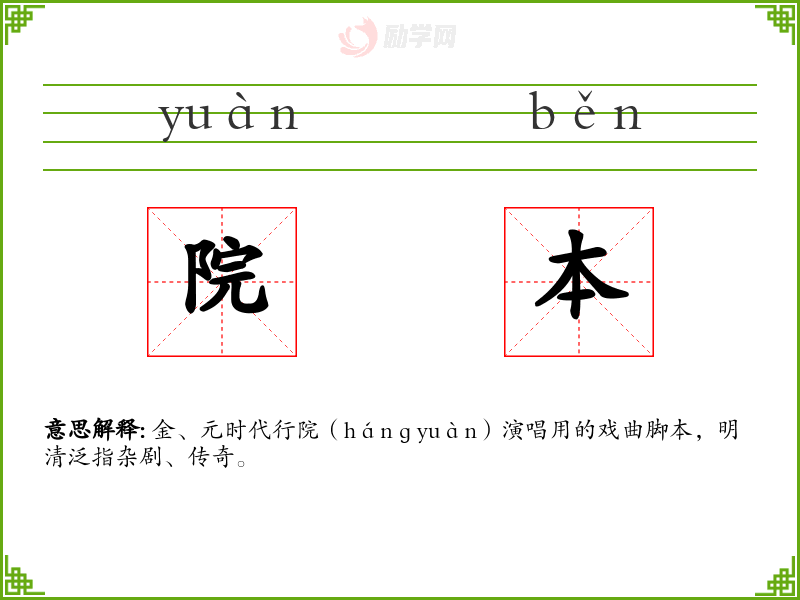 院本的意思是:金、元时代行院(hánɡyuàn)演唱用的戏曲脚本,明清泛指杂剧、传奇。