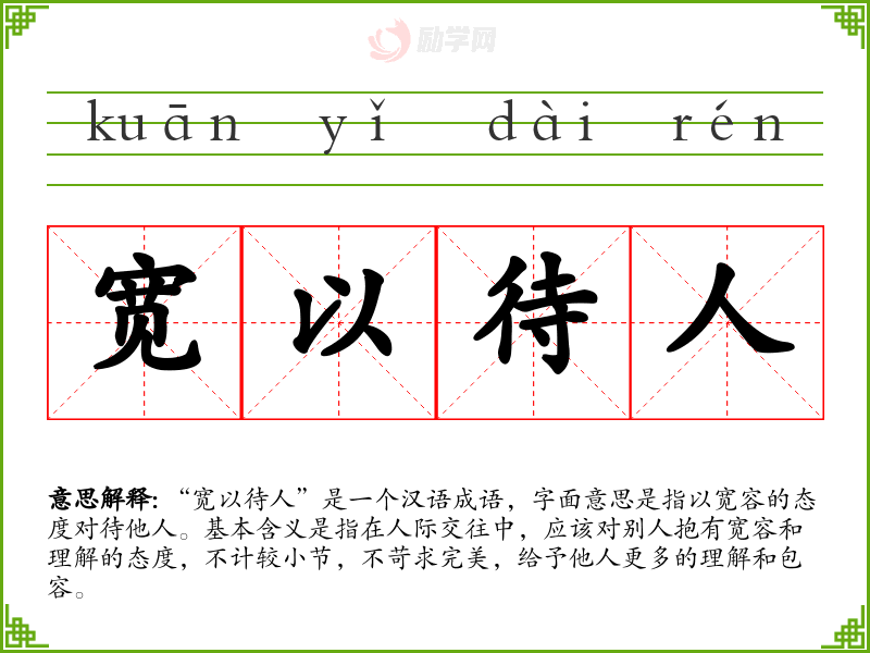 “宽以待人”是一个汉语成语,字面意思是指以宽容的态度对待他人。基本含义是指在人际交往中,应该对别人抱有宽容和理解的态度,不计较小节,不苛求完美,给予他人更多的理解和包容。