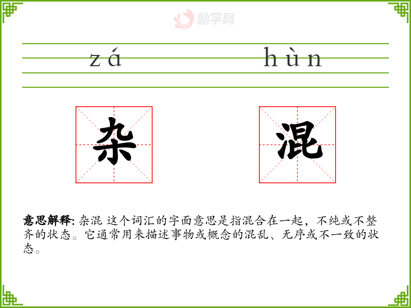 杂混 这个词汇的字面意思是指混合在一起,不纯或不整齐的状态。它通常用来描述事物或概念的混乱、无序或不一致的状态。