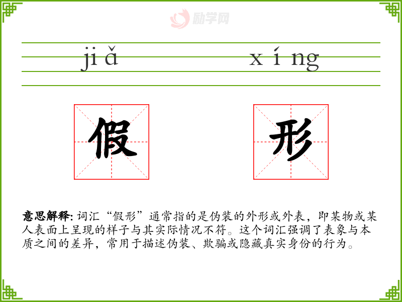 词汇“假形”通常指的是伪装的外形或外表,即某物或某人表面上呈现的样子与其实际情况不符。这个词汇强调了表象与本质之间的差异,常用于描述伪装、欺骗或隐藏真实身份的行为。