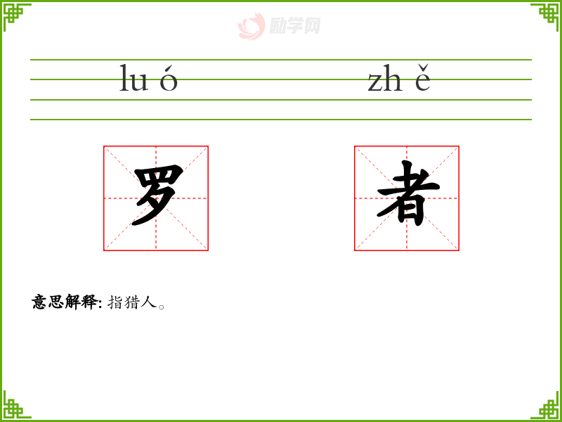 《说文》-罗,以丝罟鸟也。 《诗·王风·兔爰》-有兔爰爰,雉离于罗。 《韩非子·难三》-以天下为这罗,则雀不失矣。 曹植《野田黄雀行》-不见篱间雀,见鹞自投罗。