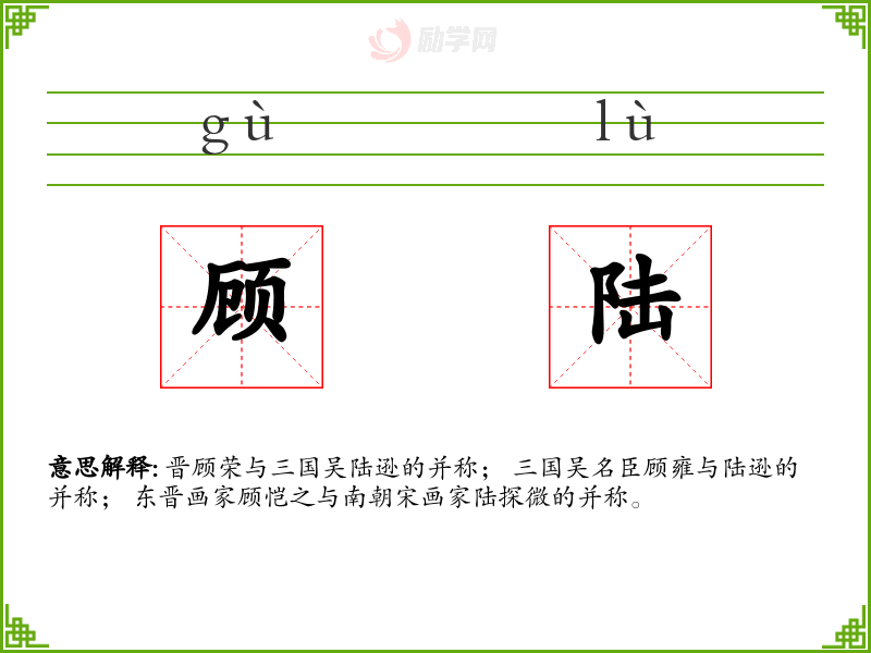 顾陆的意思是:晋顾荣与三国吴陆逊的并称; 三国吴名臣顾雍与陆逊的并称; 东晋画家顾恺之与南朝宋画家陆探微的并称。