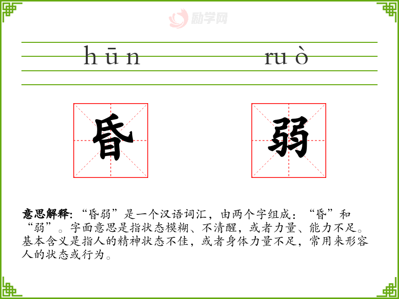 “昏”字古汉语中已有,原指日暮或模糊不清的状态。“弱”字则指力量不足。两个字组合成“昏弱”,强调了精神和身体状态的双重不佳。