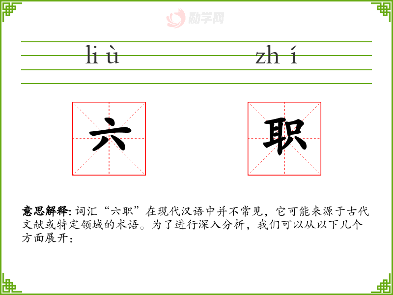词汇“六职”在现代汉语中并不常见,它可能来源于古代文献或特定领域的术语。为了进行深入分析,我们可以从以下几个方面展开: