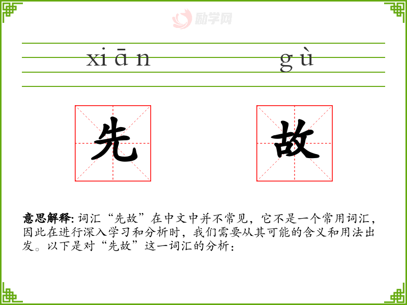 词汇“先故”在中文中并不常见,它不是一个常用词汇,因此在进行深入学*和分析时,我们需要从其可能的含义和用法出发。以下是对“先故”这一词汇的分析: