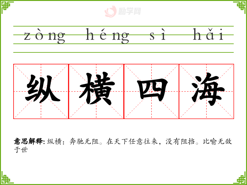 纵横四海的意思是:纵横:奔驰无阻。在天下任意往来,没有阻挡。比喻无敌于世