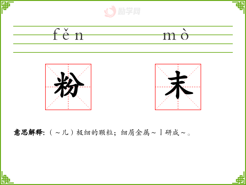 粉末的意思是:(~儿)极细的颗粒;细屑金属~ㄧ研成~。
