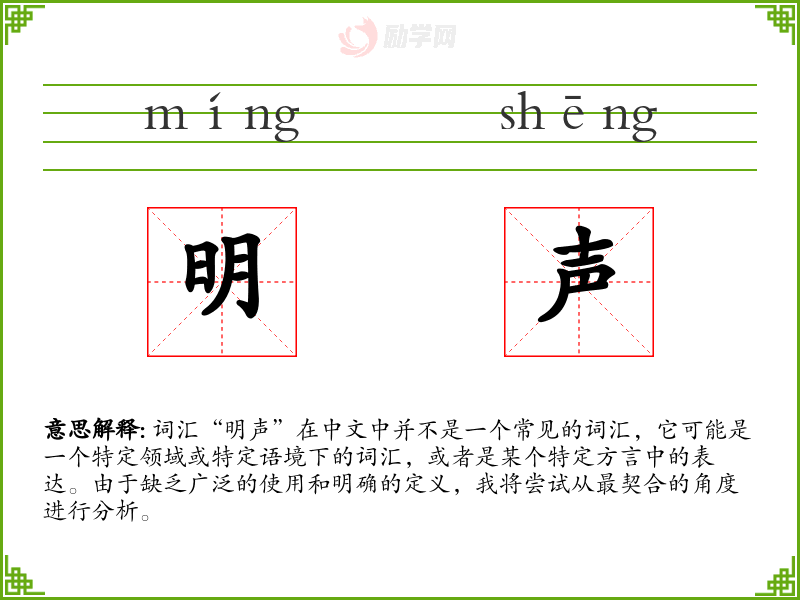“明声”作为一个可能的特定语境下的词汇,其使用和理解需要结合具体的语境。在语言学习和表达中,了解和掌握特定词汇的正确使用是非常重要的,尤其是在专业领域或特定文化背景中。