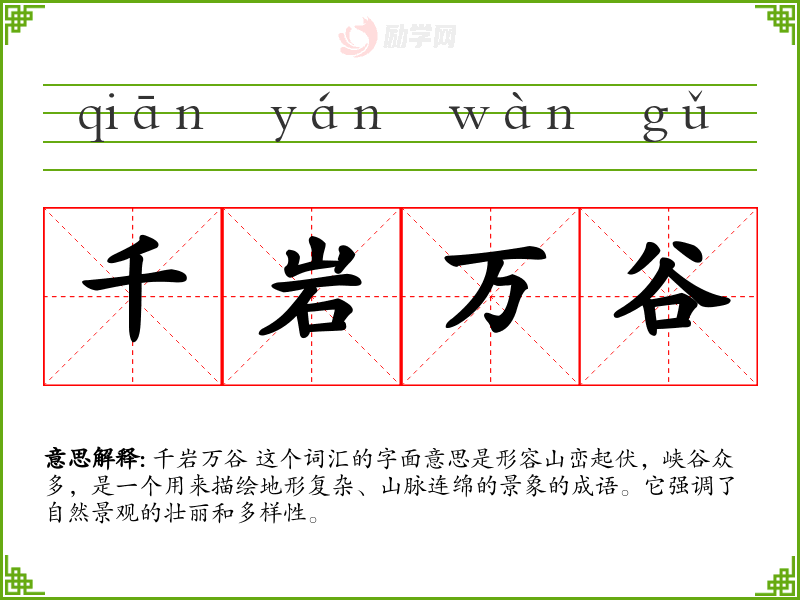 千岩万谷 这个词汇不仅描绘了自然景观的壮丽,也承载了文化和情感的深度。在我的语言学*和表达中,它是一个重要的词汇,帮助我更好地理解和欣赏自然界的美丽和复杂性。