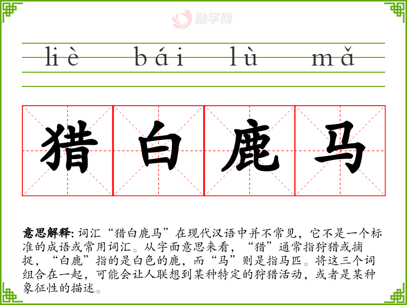 “猎白鹿马”可能指的是一种特定的狩猎活动,其中猎物是白色的鹿,或者是与白色鹿相关的马匹。然而,由于这个词汇并不常见,其确切含义可能需要更多的上下文来确定。