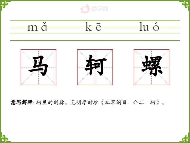 马轲螺的意思是:珂贝的别称。见明李时珍《本草纲目.介二.珂》。