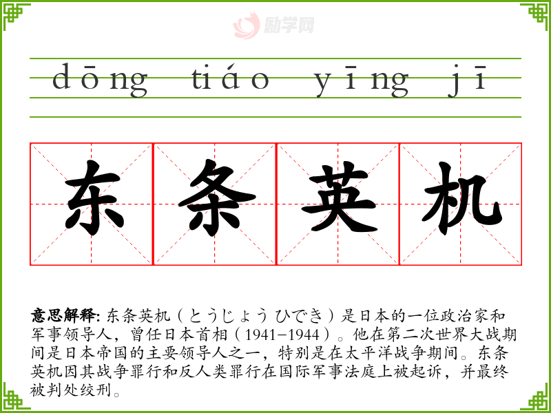 东条英机的意思是:日本首相。出身于军阀家庭。曾任关东军参谋长。卢沟桥事变发生后,率日军侵占华北地区。1941年出任首相,兼陆相、内相,独揽军政大权。同年升为陆军大将,12月发动太平洋战争。日本投降后,自杀未遂◇被定为甲级战犯,处以绞刑。