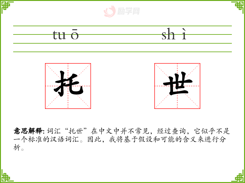 词汇“托世”在中文中并不常见,经过查询,它似乎不是一个标准的汉语词汇。因此,我将基于假设和可能的含义来进行分析。