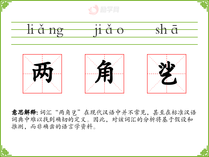 词汇“两角乷”在现代汉语中并不常见,甚至在标准汉语词典中难以找到确切的定义。因此,对该词汇的分析将基于假设和推测,而非确凿的语言学资料。