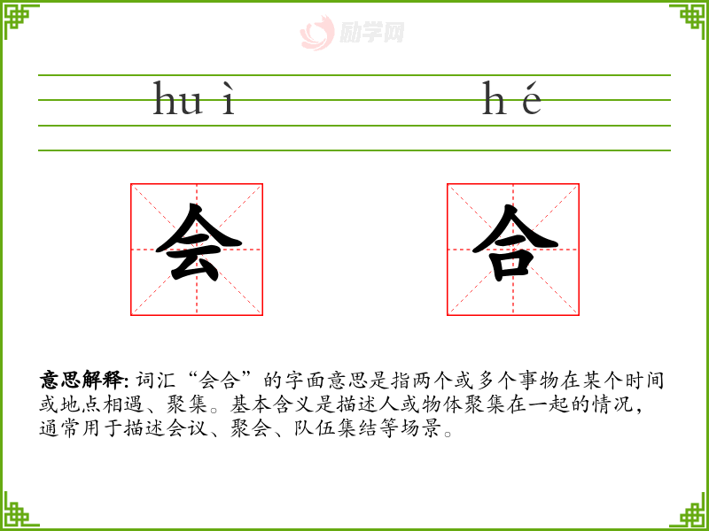 词汇“会合”的字面意思是指两个或多个事物在某个时间或地点相遇、聚集。基本含义是描述人或物体聚集在一起的情况,通常用于描述会议、聚会、队伍集结等场景。