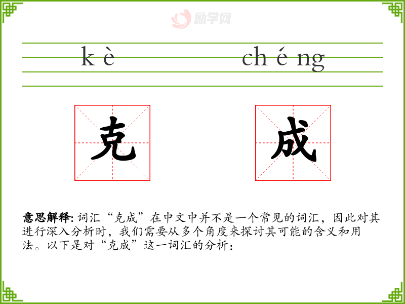 “克成”这一词汇虽然不常见,但它传递了一种积极向上的精神,即通过不懈努力克服困难并达成目标。在语言学习和表达中,了解和运用这样的词汇可以丰富我们的表达方式,增强语言的表现力。