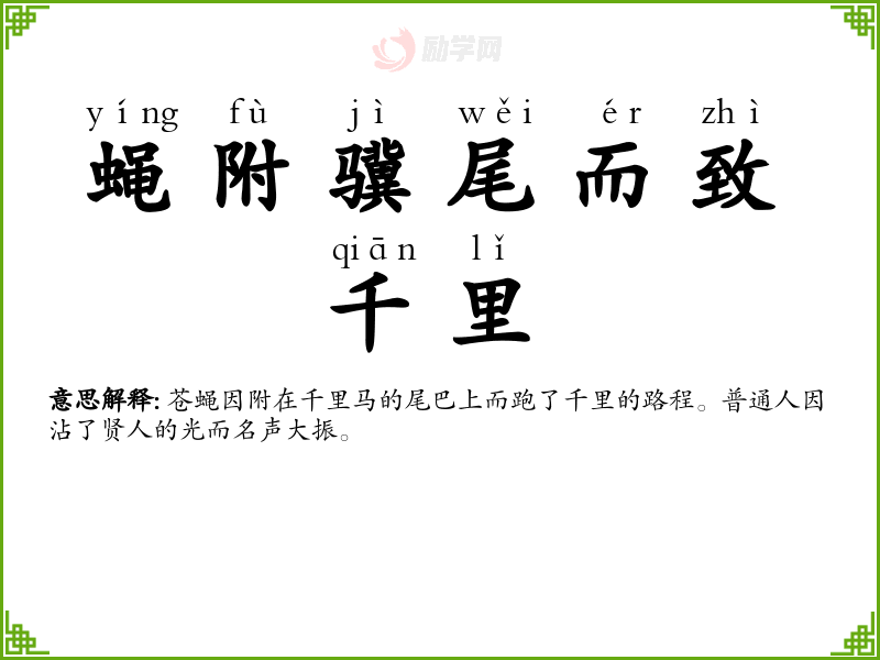 苍蝇因附在千里马的尾巴上而跑了千里的路程。普通人因沾了贤人的光而名声大振。