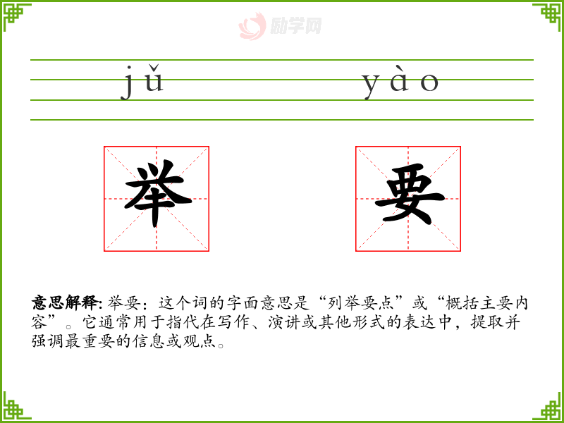 “举要”一词源自汉语,其结构由“举”(提起、列举)和“要”(重要、关键)组成。在古代文献中已有使用,现代汉语中继续保持其基本含义,但在使用频率和语境上有所扩展。