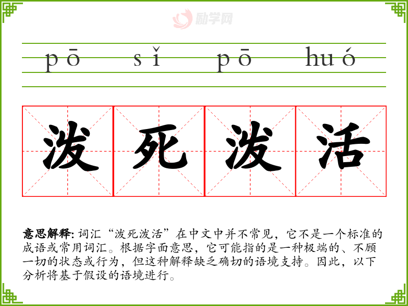 词汇“泼死泼活”在中文中并不常见,它不是一个标准的成语或常用词汇。根据字面意思,它可能指的是一种极端的、不顾一切的状态或行为,但这种解释缺乏确切的语境支持。因此,以下分析将基于假设的语境进行。