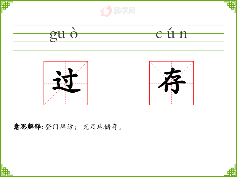过存的意思是:登门拜访; 充足地储存。