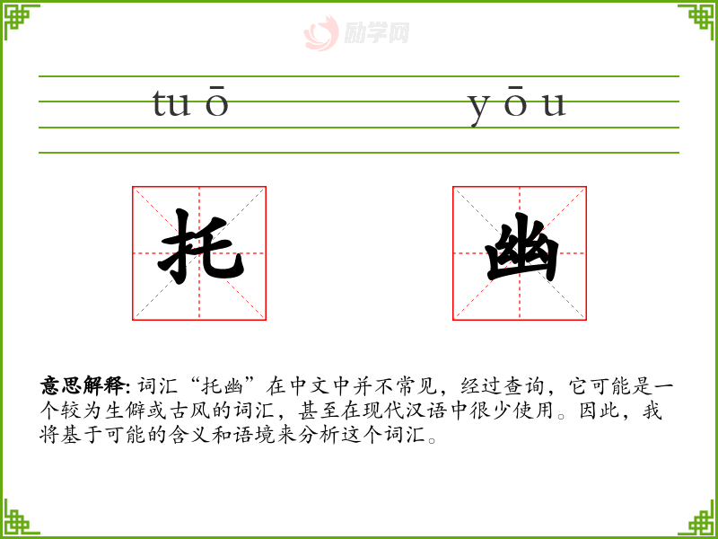 词汇“托幽”在中文中并不常见,经过查询,它可能是一个较为生僻或古风的词汇,甚至在现代汉语中很少使用。因此,我将基于可能的含义和语境来分析这个词汇。