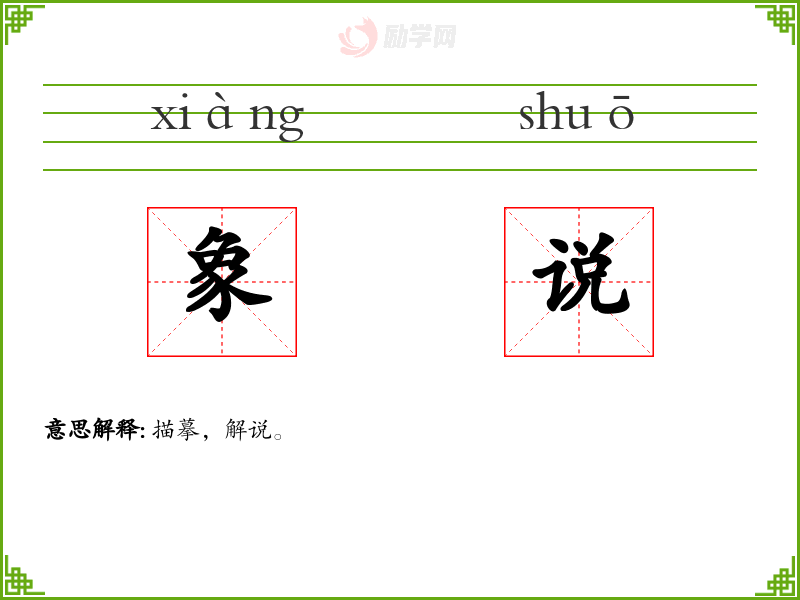 (象形。甲骨文字形,突出其长鼻。本义:大象,一种哺乳动物)。